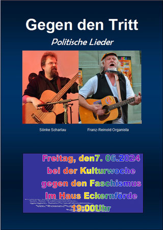 Veranstaltung von Franz Organista, ein politischer Liederabend , mit verschiedenen Musikern am 28. April 2018 in der gut besuchten Bürgerbegegnungstätte in Eckernförde durchgeführt.